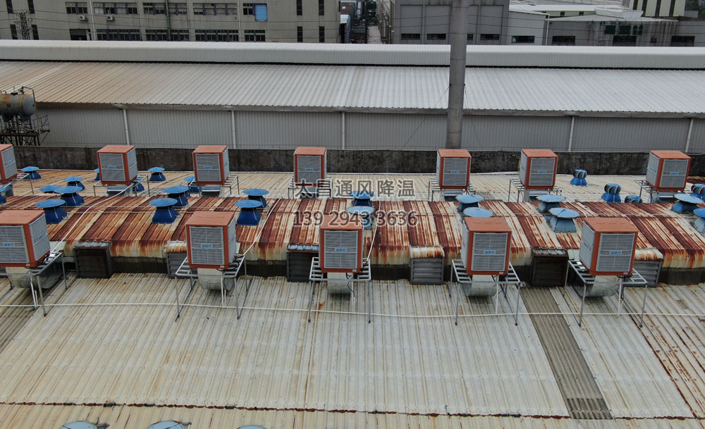 "潤東方"環(huán)??照{(diào),安裝費(fèi)用低,運(yùn)行費(fèi)用少,平均每百平方米車間每小時降溫費(fèi)用僅需1度電,特別適合在生產(chǎn)型企業(yè)的車間里使用,下圖為東莞某大型鋼結(jié)構(gòu)車間安裝潤東方環(huán)保空調(diào)的工程圖片: