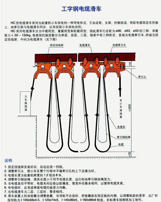 該系列滑車分Ⅰ、Ⅱ、Ⅲ、Ⅳ、Ⅴ五種型號,工字鋼電纜滑線如用戶采用12#、14#、16#或更大號數(shù)工字鋼,可在訂貨時注明,本廠可成套供貨。