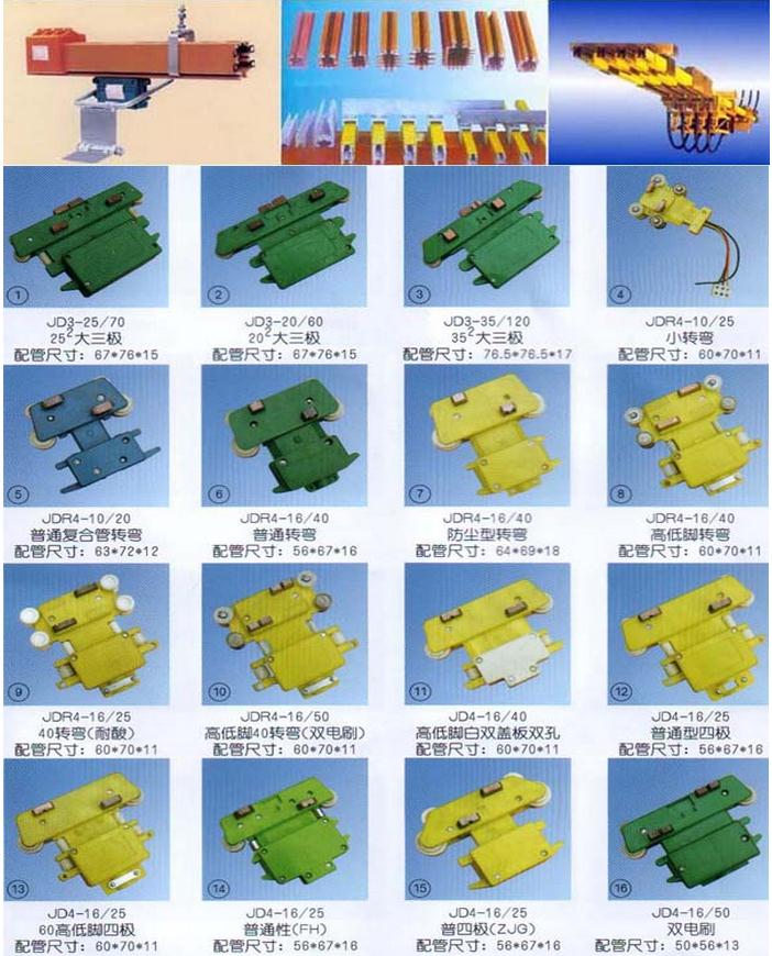 選用滑觸線集電器的時候,首選集電器最好是考慮和滑觸線相配套,不要亂用集電器,否則會影響行車的正常運行,嚴(yán)重了會燒壞滑觸線。集電器上面的靴片是由含銅碳基壓而成的,購買后要檢查與滑線的吻合型。由于集電器本身屬于易耗品,長期使用會磨損靴片,所以要定期檢查,集電器上面靴片的磨損程度,并定期更換。
